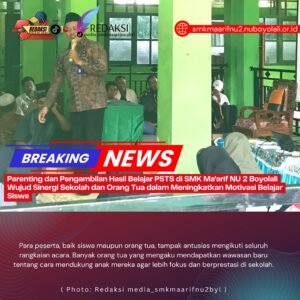 Acara Parenting ini menghadirkan tausiah inspiratif dari Kyai Sriyono asal Ampel, Boyolali, yang memberikan motivasi agar siswa selalu bersemangat menuntut ilmu dan berbakti kepada orang tua serta guru. Dalam kesempatan tersebut, Kepala Sekolah SMK Ma’arif NU 2 Boyolali, Bapak Kristanto, S.Pd., M.Pd., juga memberikan pesan motivasi kepada seluruh siswa agar tidak mudah menyerah dalam belajar dan terus berprestasi. Beliau menegaskan bahwa keberhasilan pendidikan tidak lepas dari kerja sama antara sekolah, orang tua, dan siswa itu sendiri.