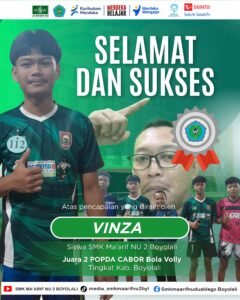 Vinza,siswa SMK Ma’arif NU 2 Klego Boyolali, sukses meraih Juara 2 POPDA Cabor Bola Voli Tingkat Kabupaten Boyolali! Prestasi ini membuktikan bahwa kerja keras dan semangat tim mampu menggapai hasil yang gemilang. Sukses selalu, Vinza! #POPDA #BolaVoli #Boyolali #SMKHebat